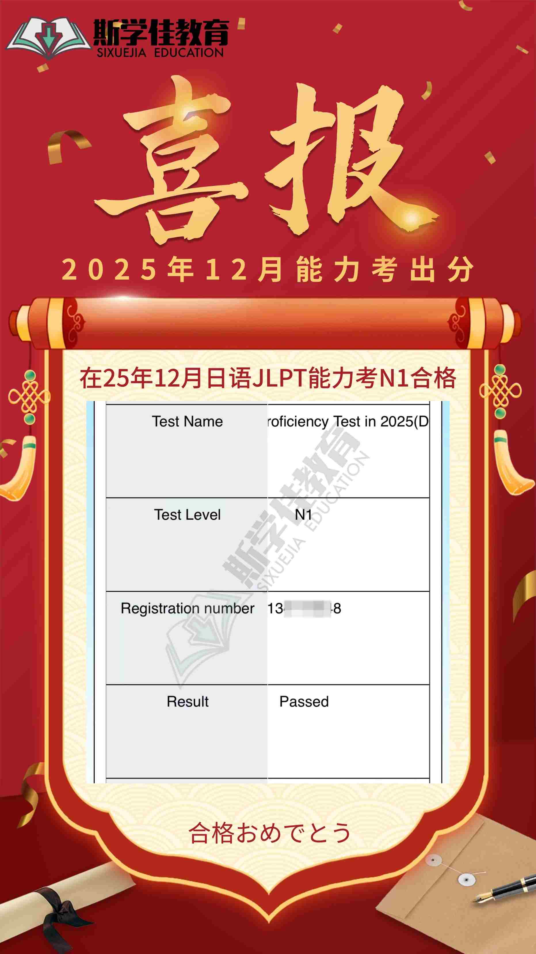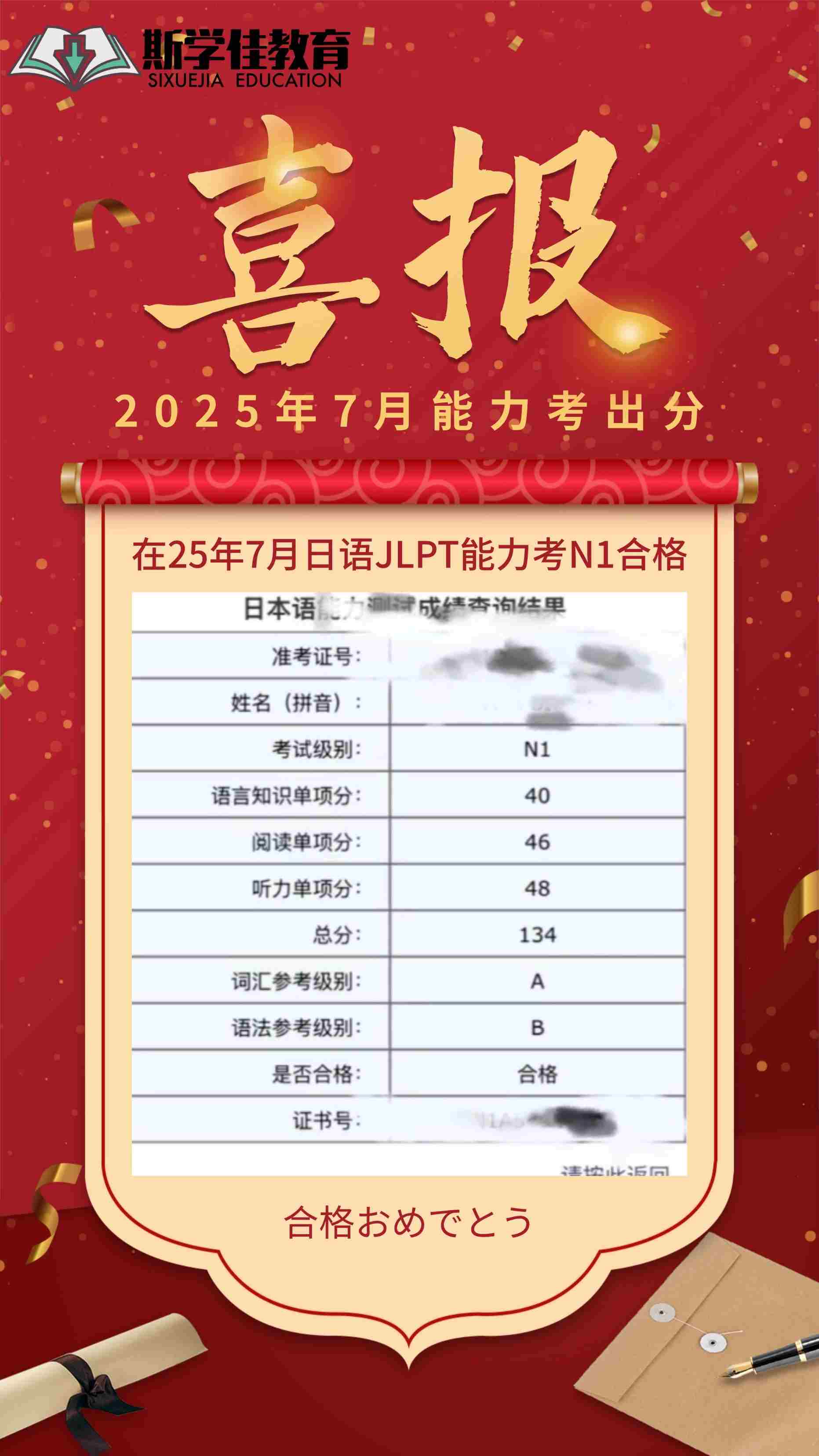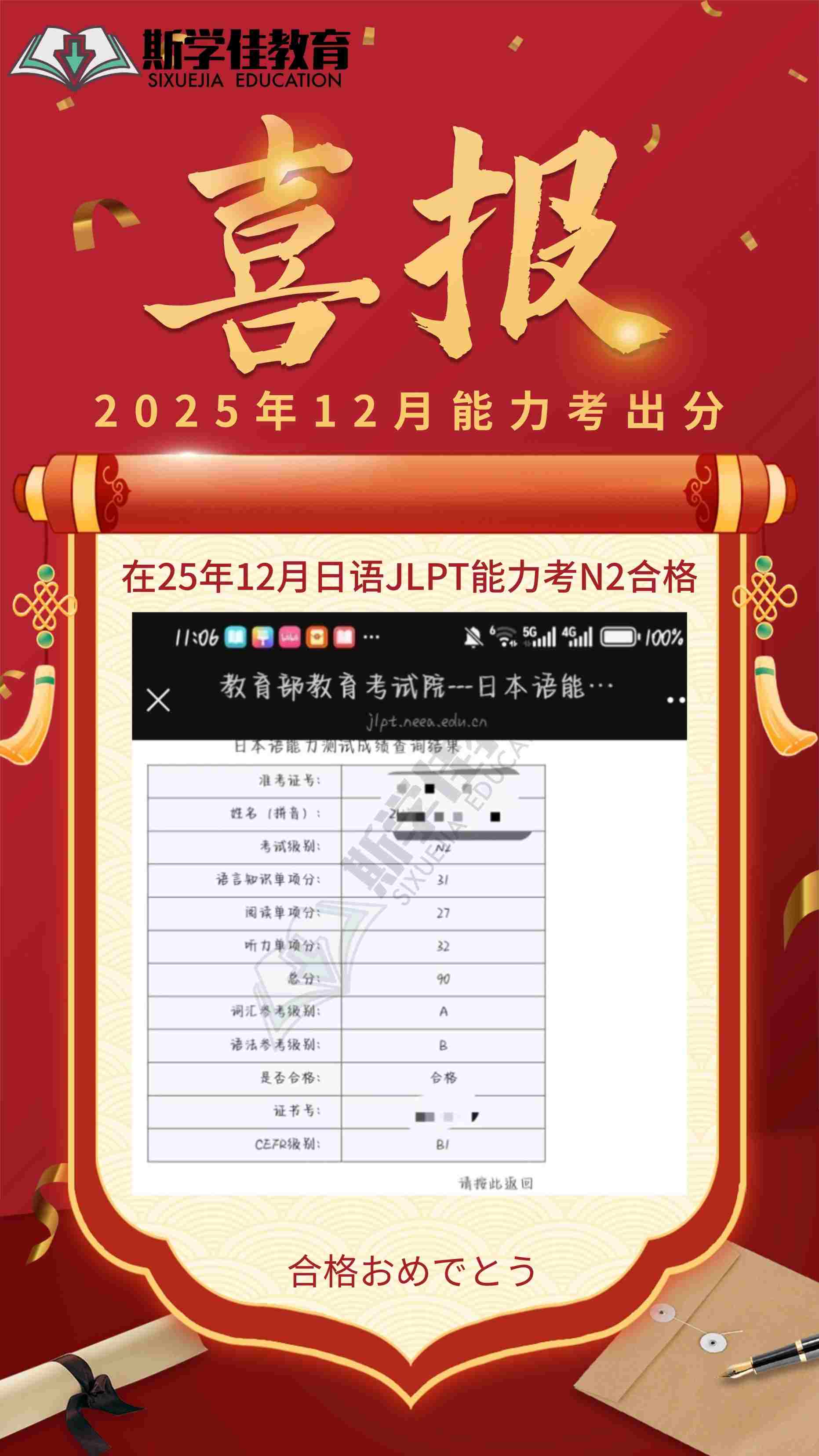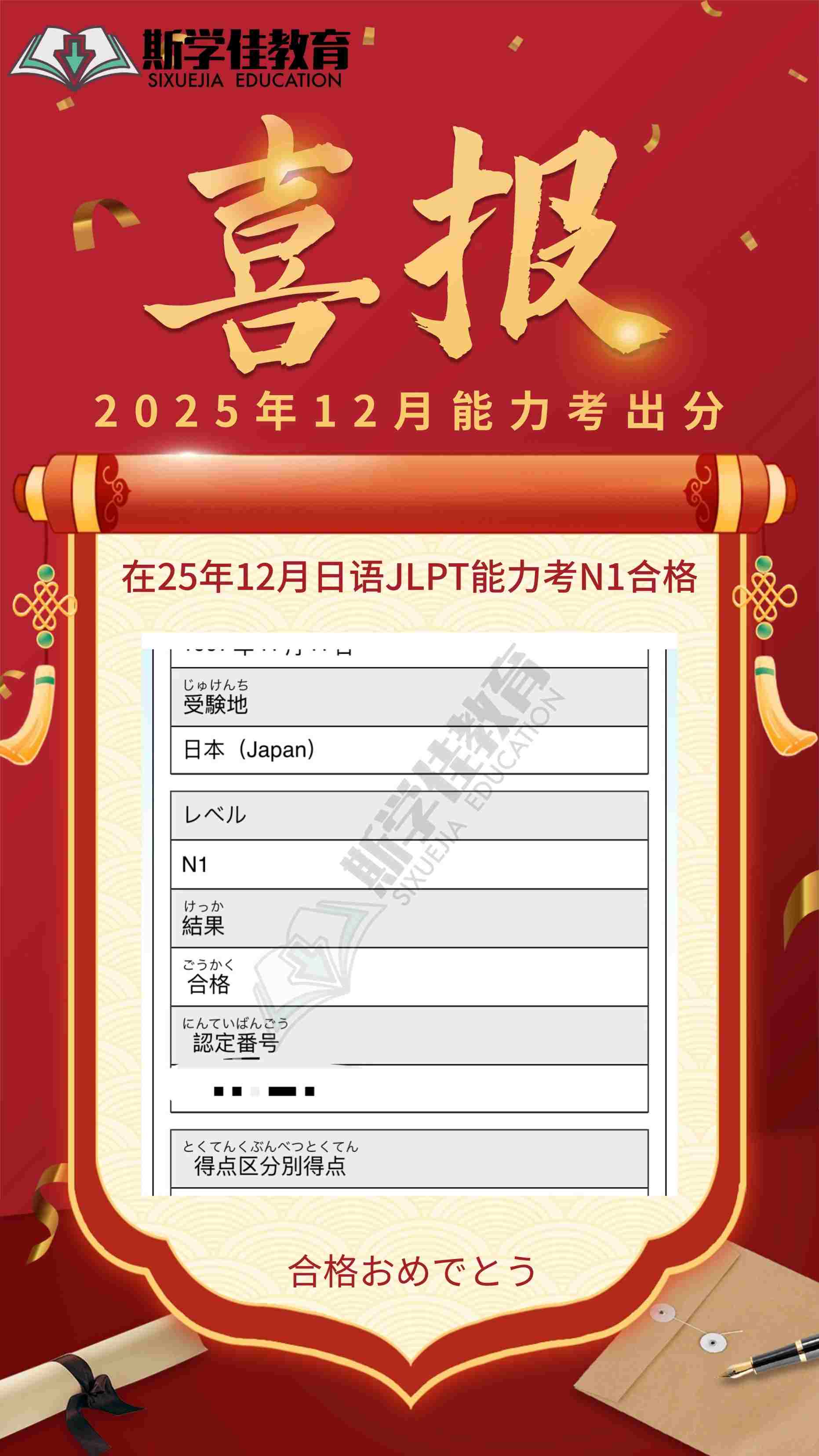 在全球化日益深入的今天,语言不仅是沟通的桥梁,更是连接文化与职业发展的重要纽带。在刚刚结束的日本语能力测试(JLPT)中,斯学佳教育再度迎来高光时刻,众多学员在N1、N2考试中取得优异成绩,捷报频传。