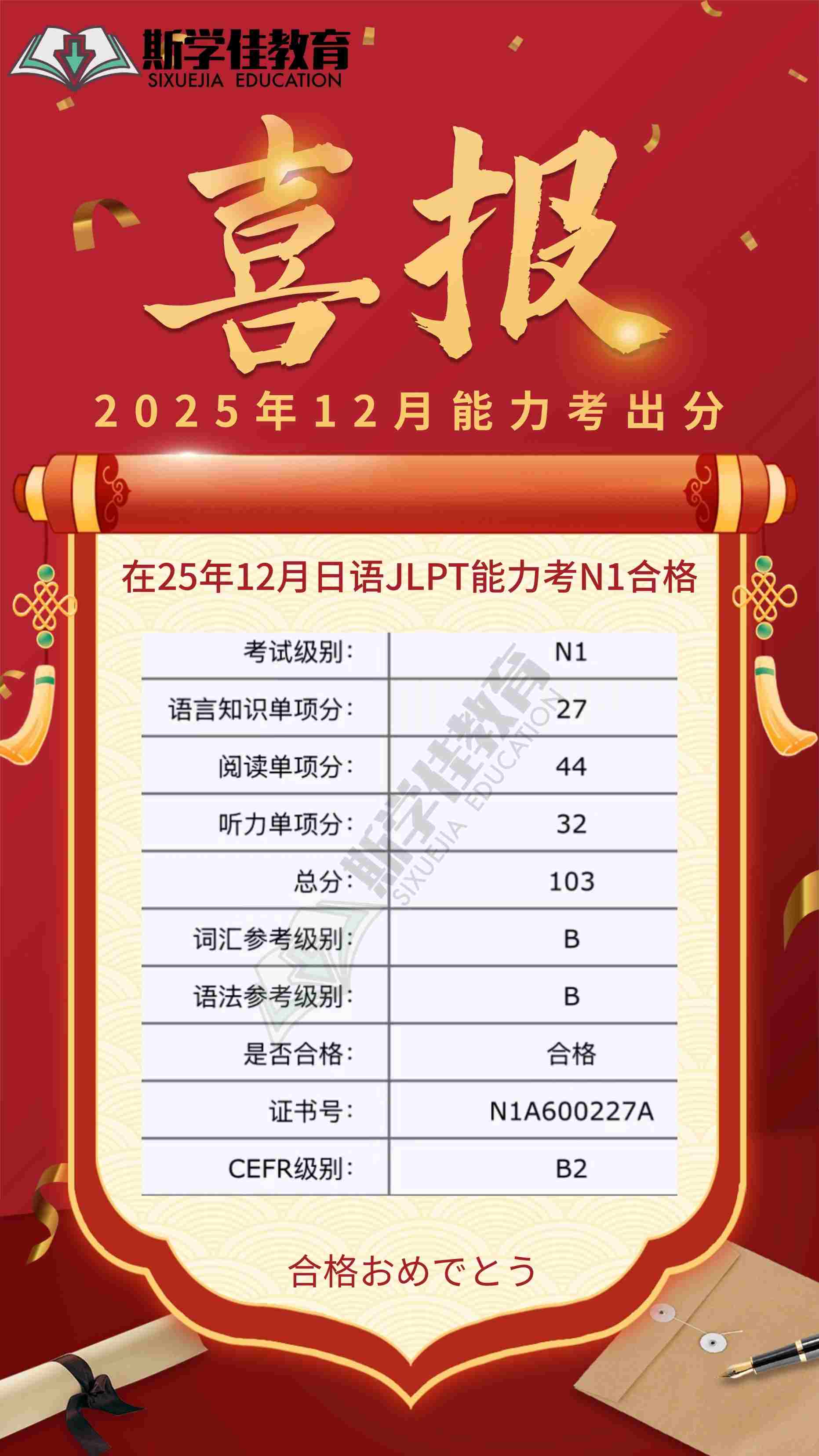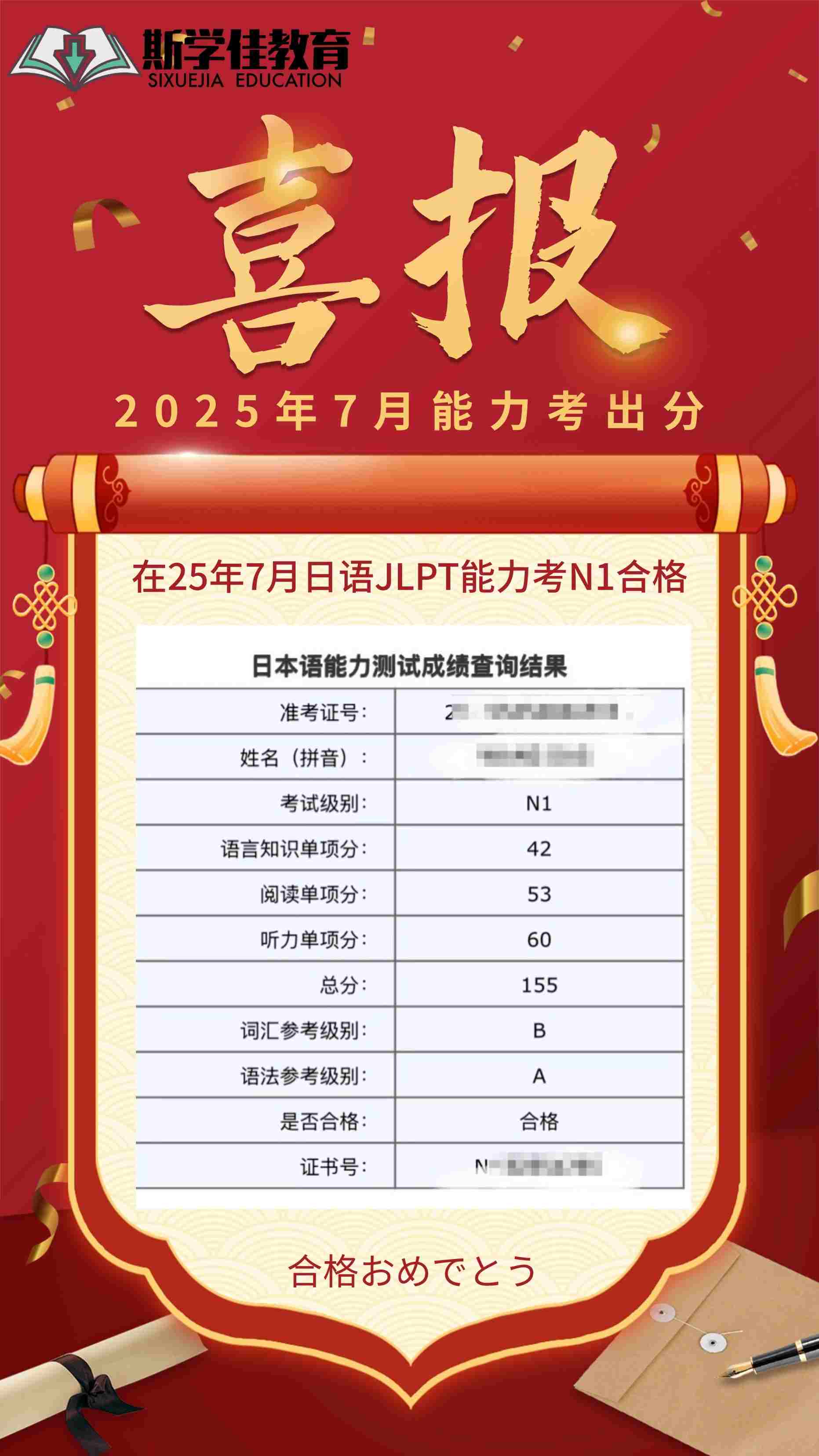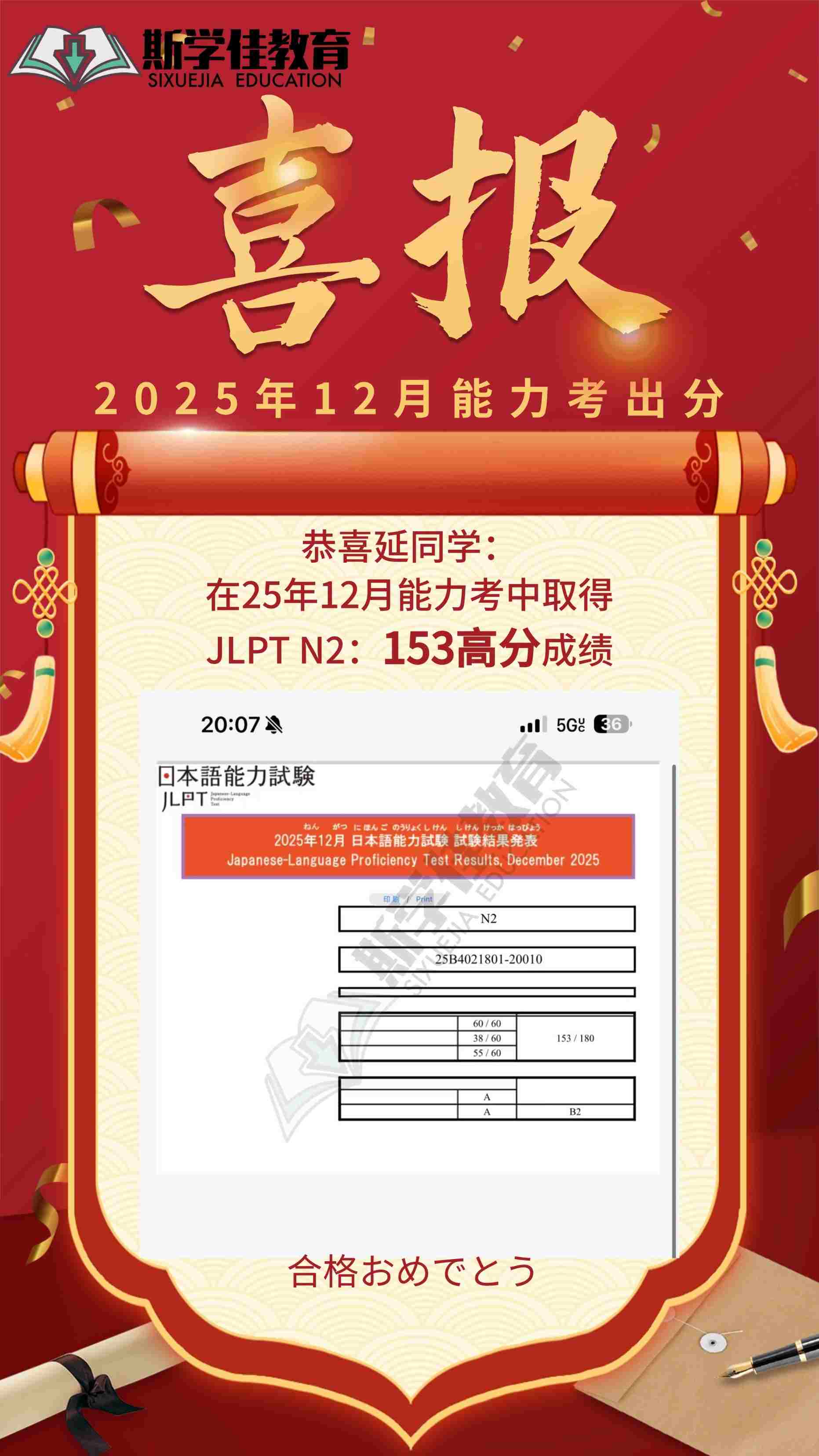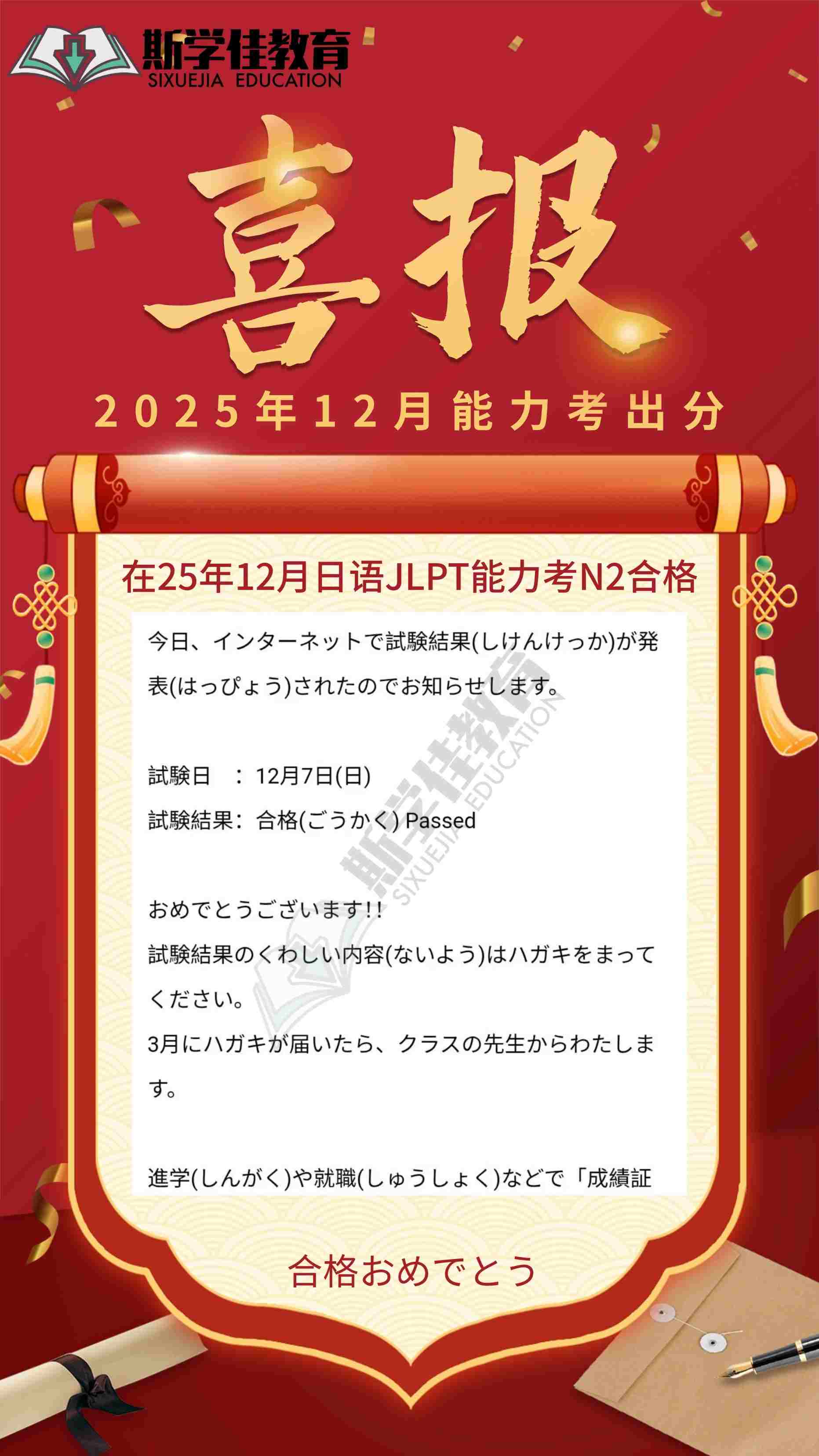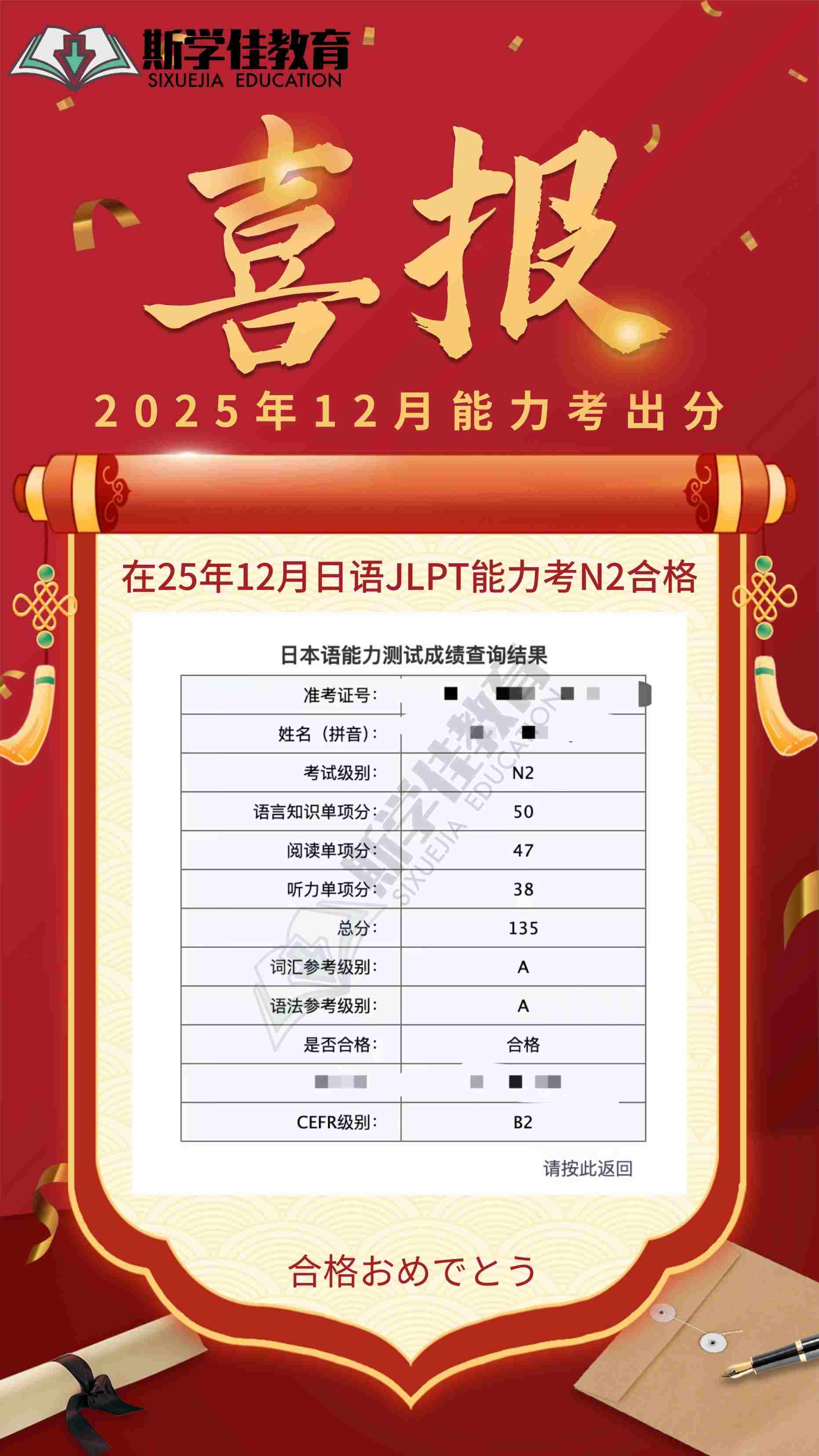 在全球化日益深入的今天,语言不仅是沟通的桥梁,更是连接文化与职业发展的重要纽带。在刚刚结束的日本语能力测试(JLPT)中,斯学佳教育再度迎来高光时刻,众多学员在N1、N2考试中取得优异成绩,捷报频传。