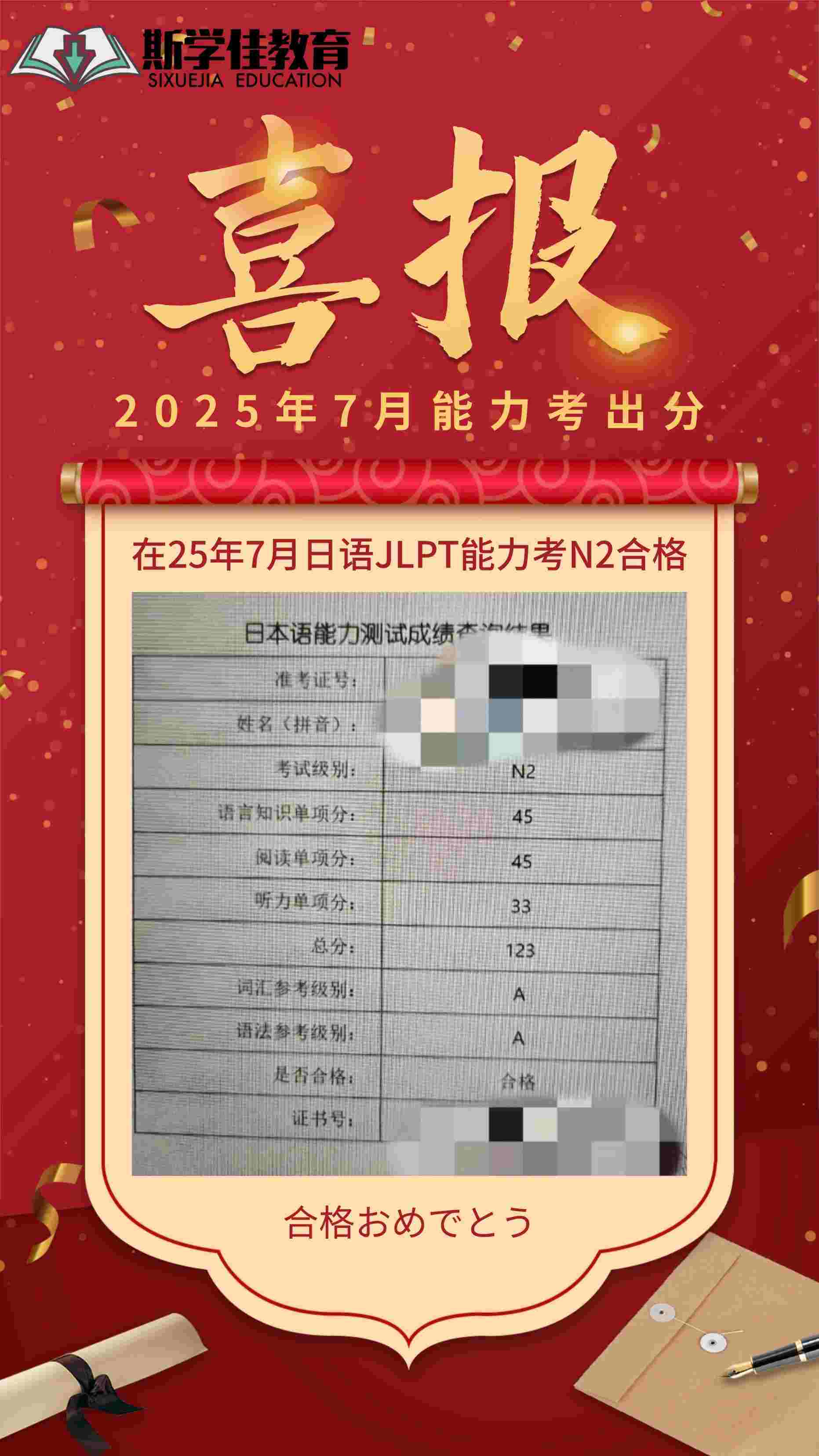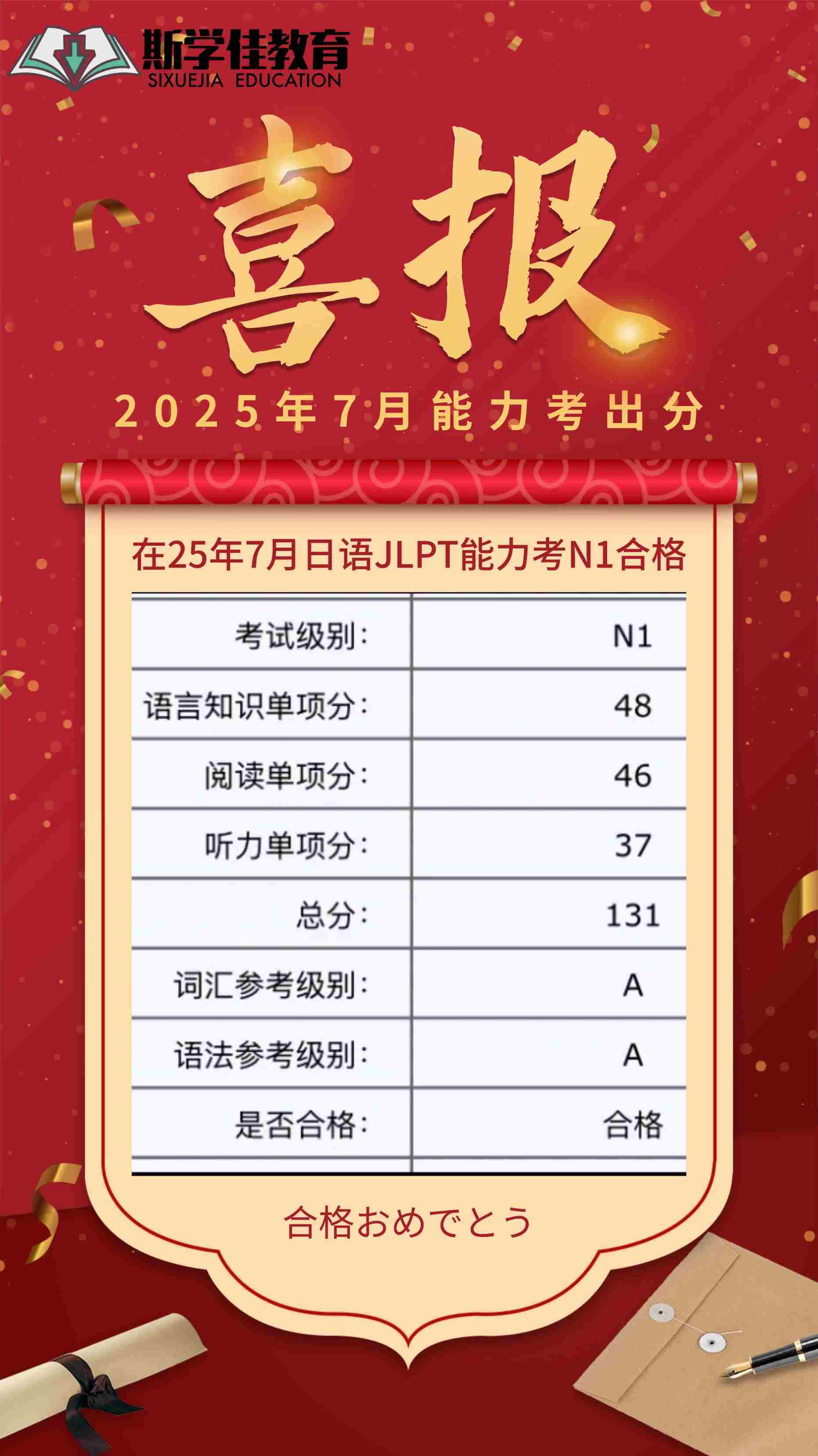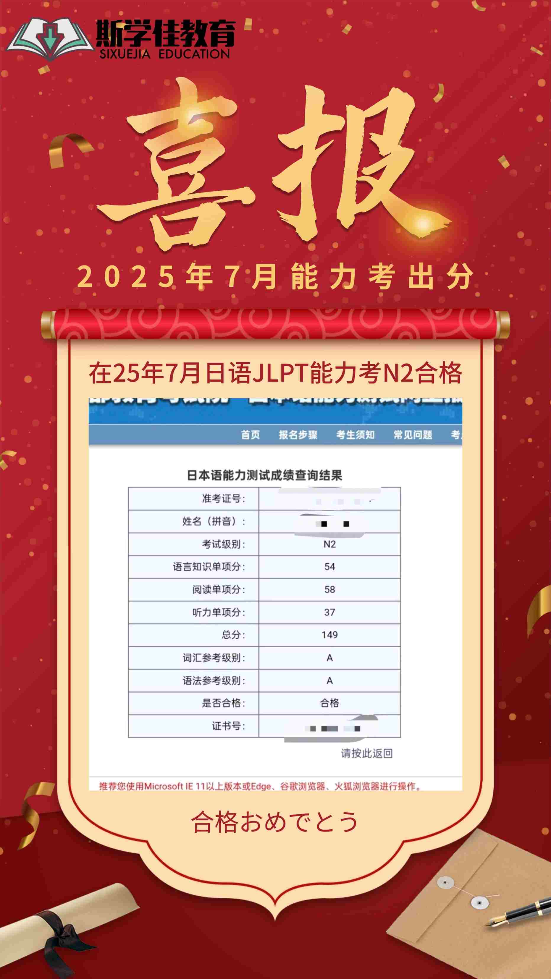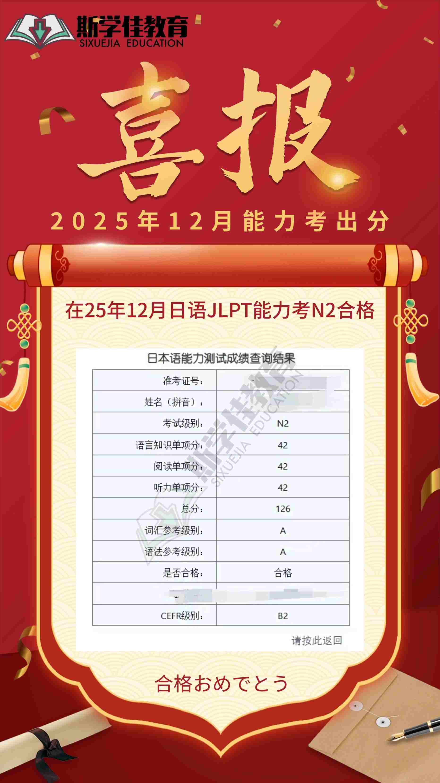 在全球化日益深入的今天,语言不仅是沟通的桥梁,更是连接文化与职业发展的重要纽带。在刚刚结束的日本语能力测试(JLPT)中,斯学佳教育再度迎来高光时刻,众多学员在N1、N2考试中取得优异成绩,捷报频传。