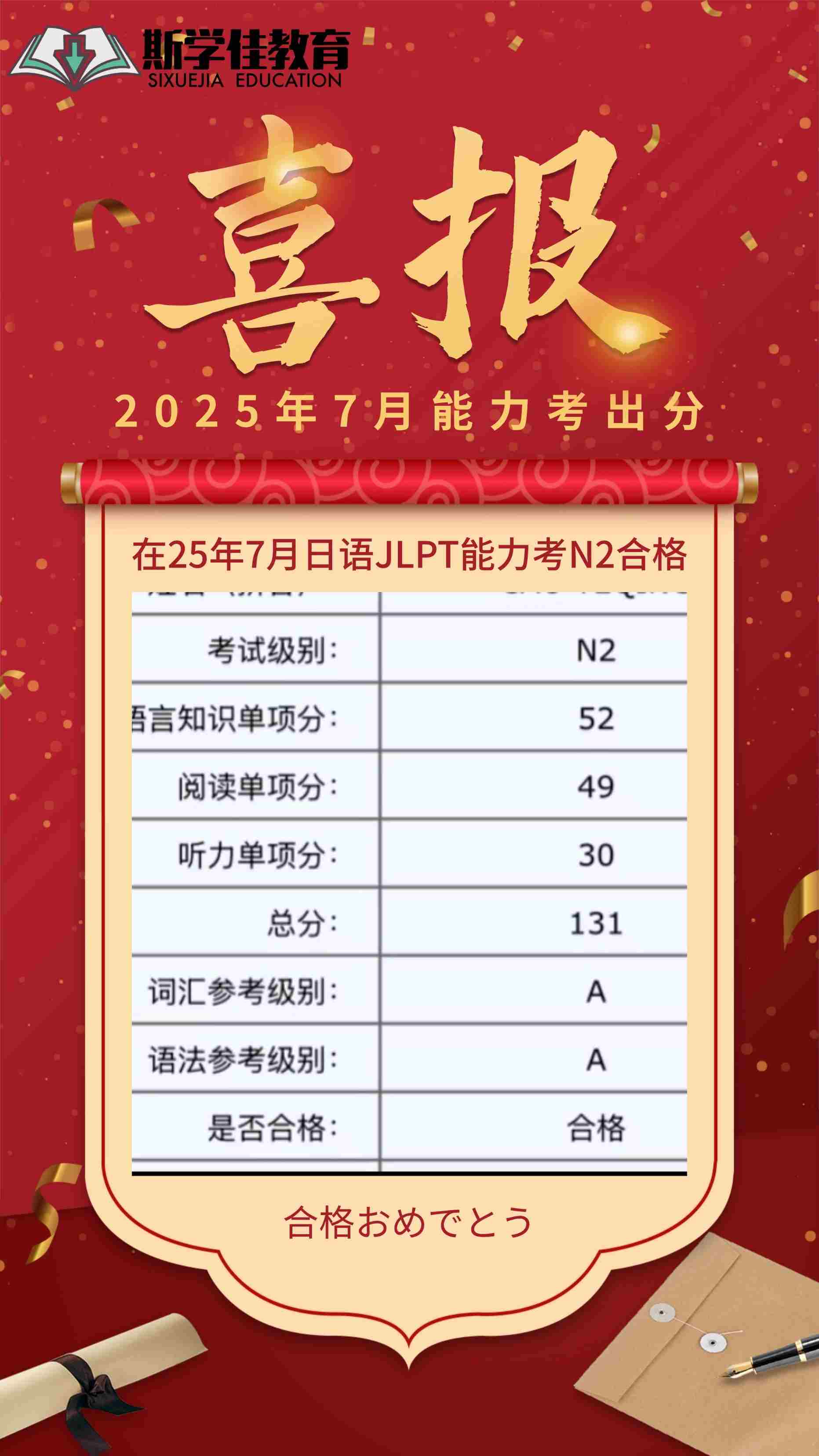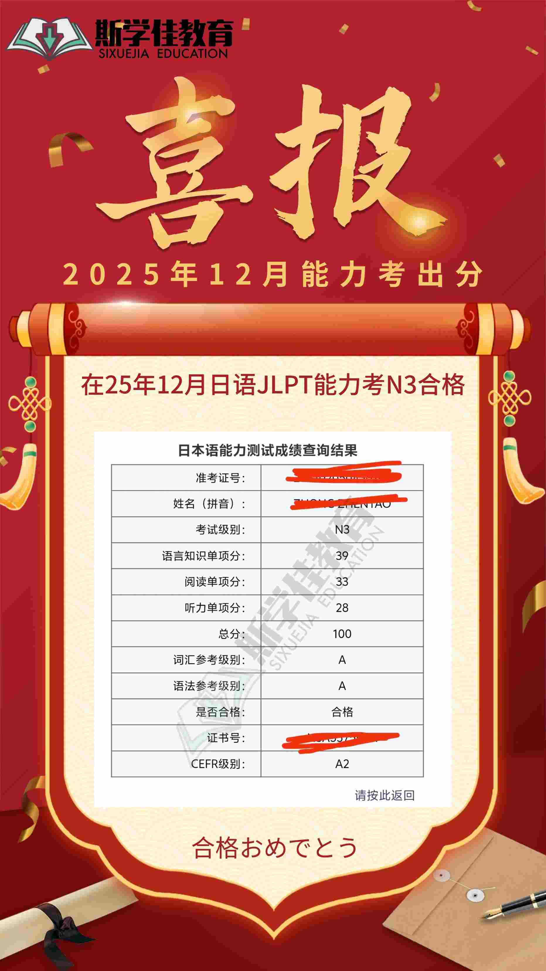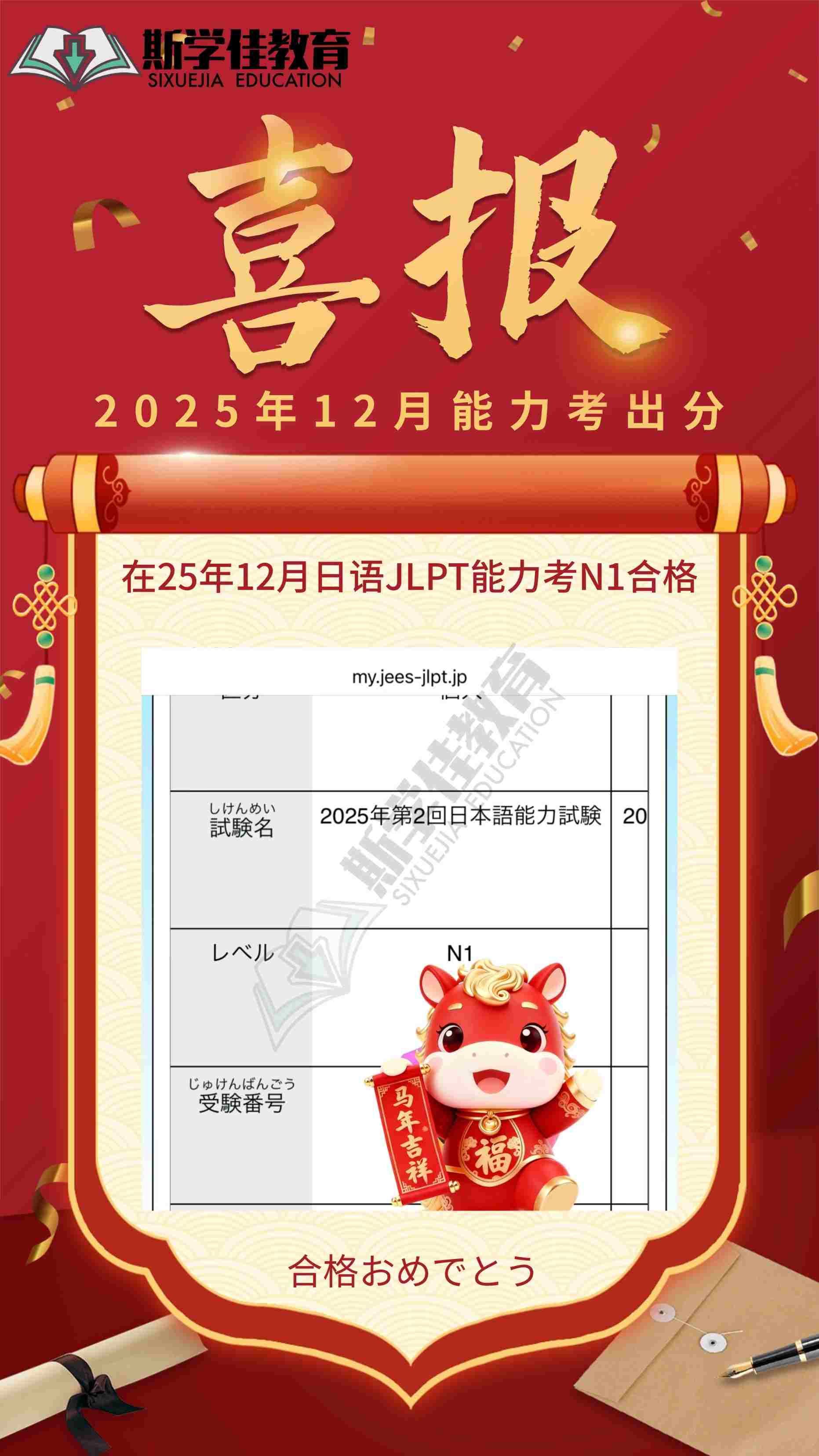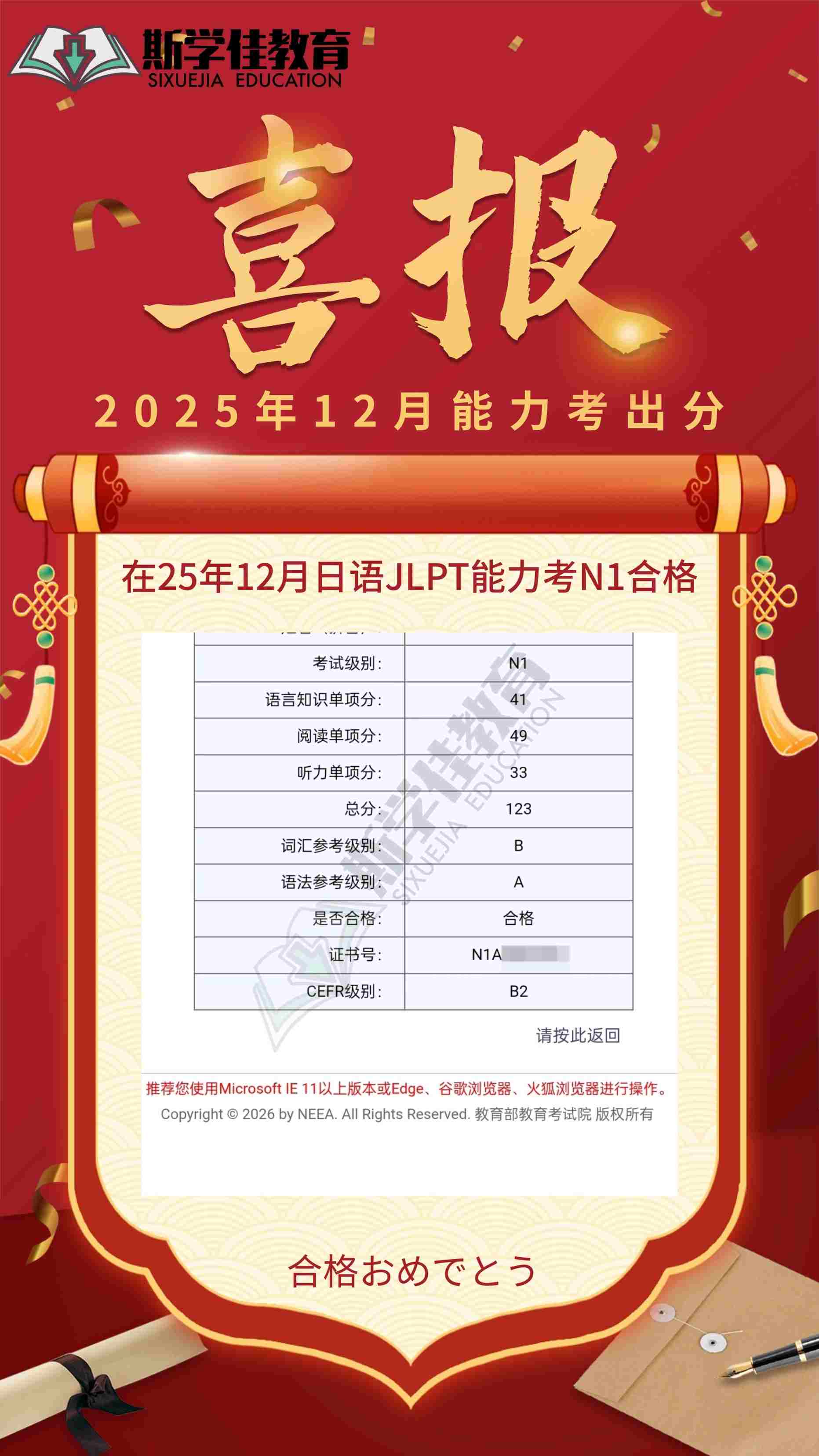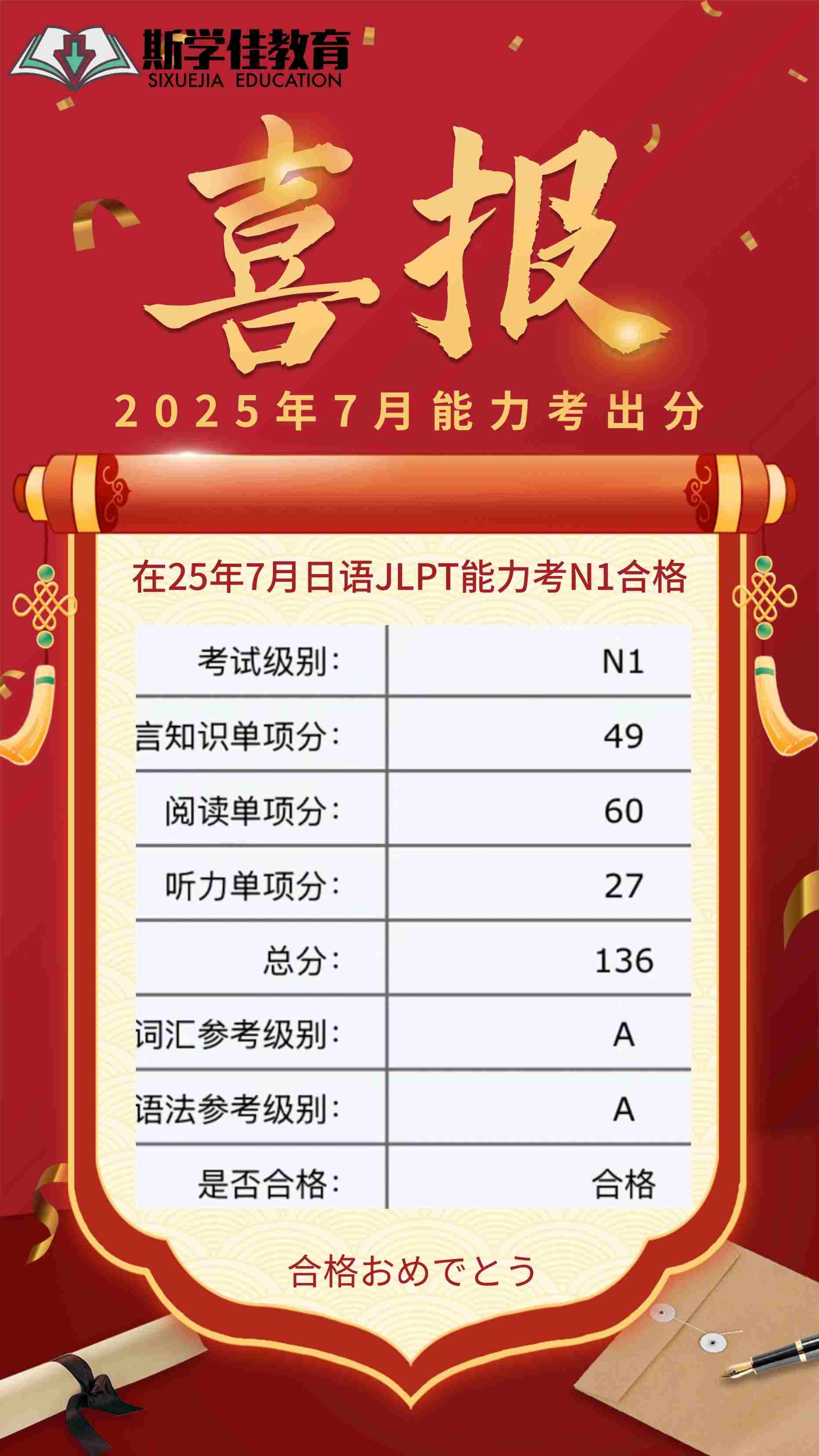 在全球化日益深入的今天,语言不仅是沟通的桥梁,更是连接文化与职业发展的重要纽带。在刚刚结束的日本语能力测试(JLPT)中,斯学佳教育再度迎来高光时刻,众多学员在N1、N2考试中取得优异成绩,捷报频传。