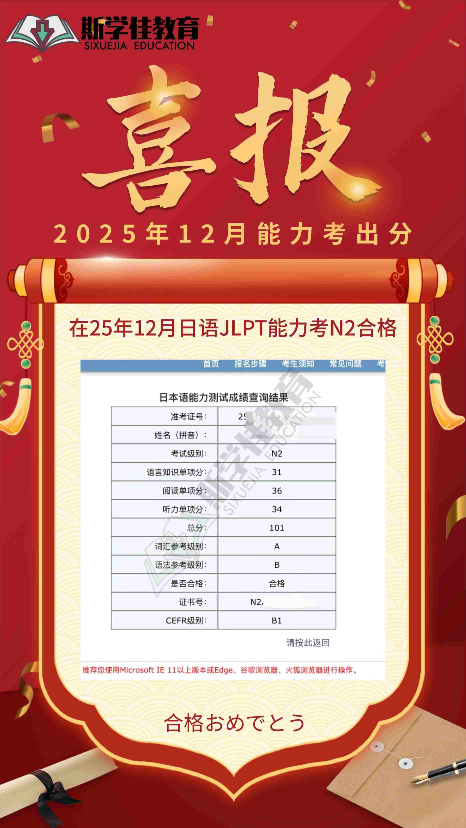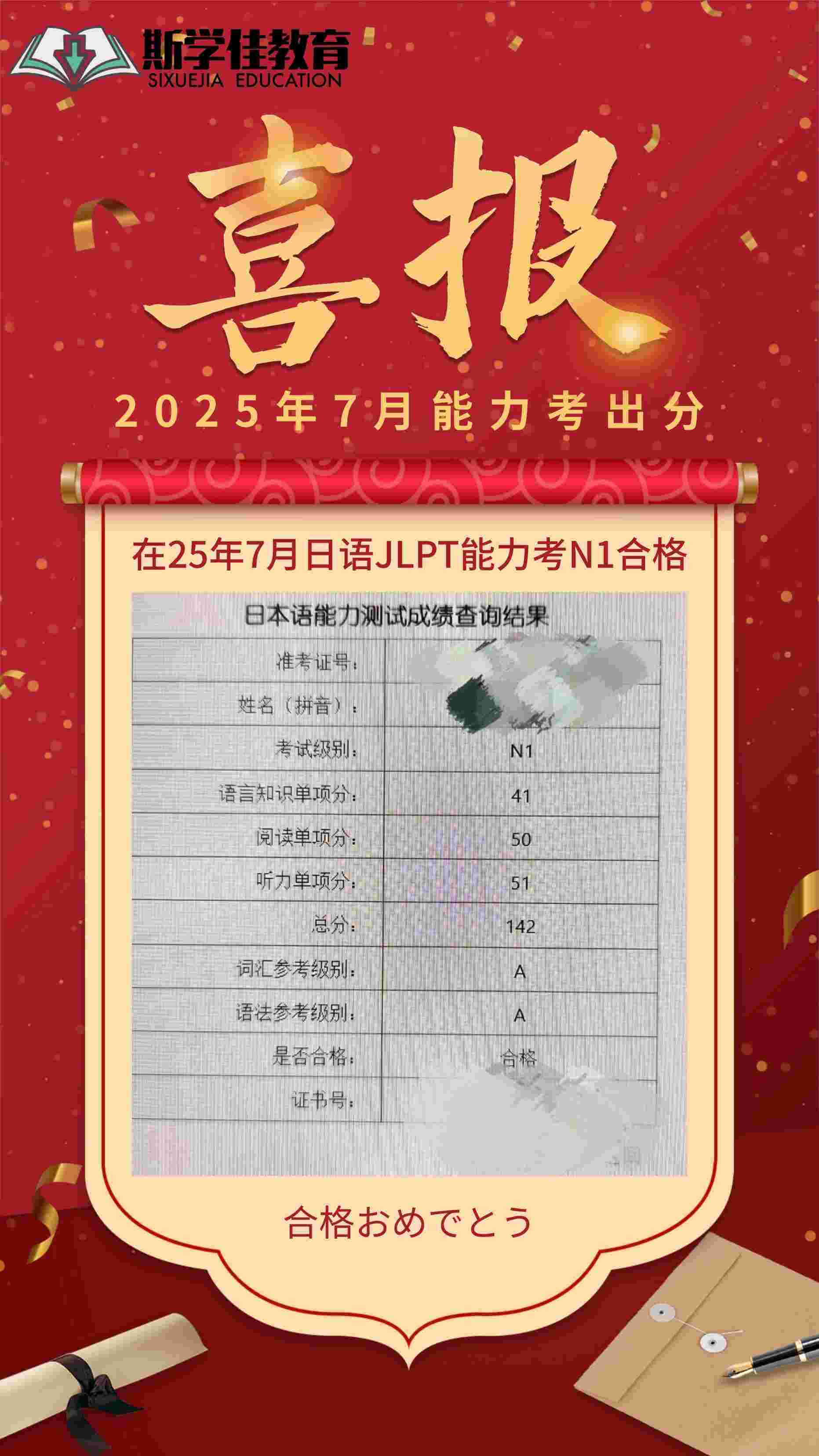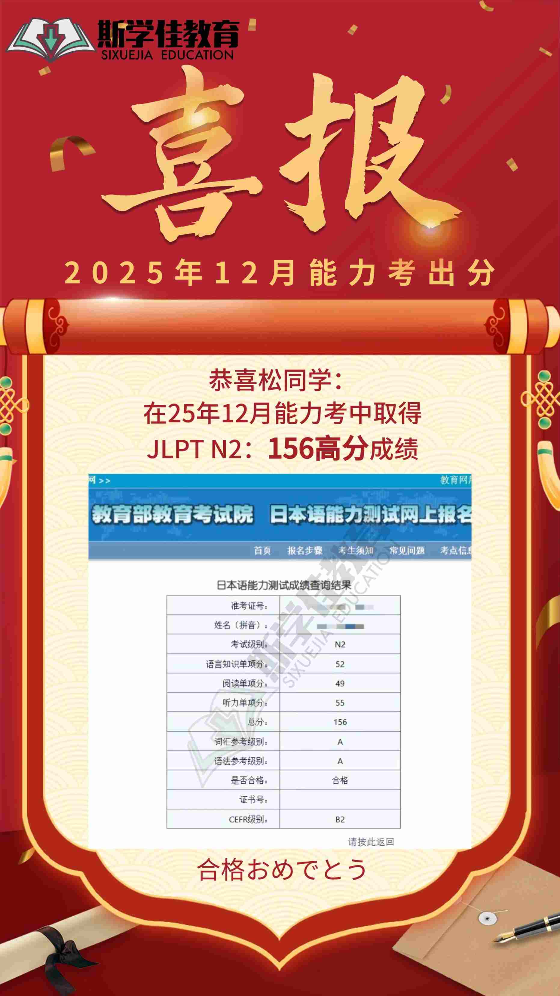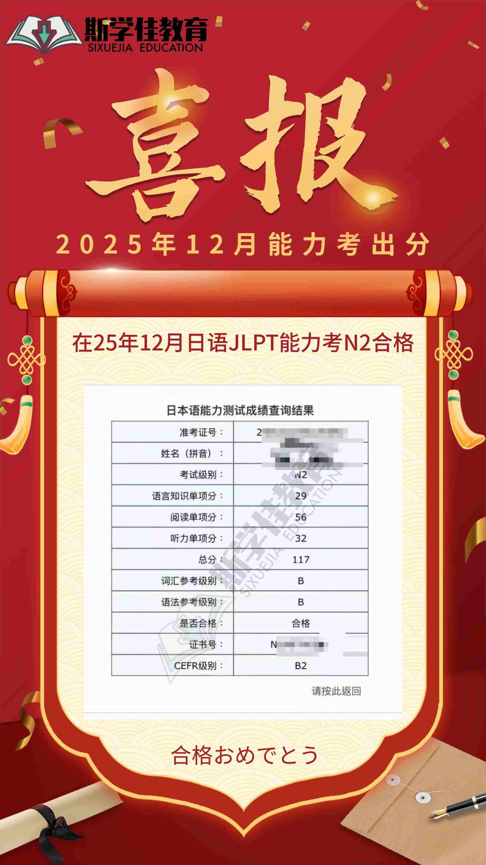 在全球化日益深入的今天,语言不仅是沟通的桥梁,更是连接文化与职业发展的重要纽带。在刚刚结束的日本语能力测试(JLPT)中,斯学佳教育再度迎来高光时刻,众多学员在N1、N2考试中取得优异成绩,捷报频传。