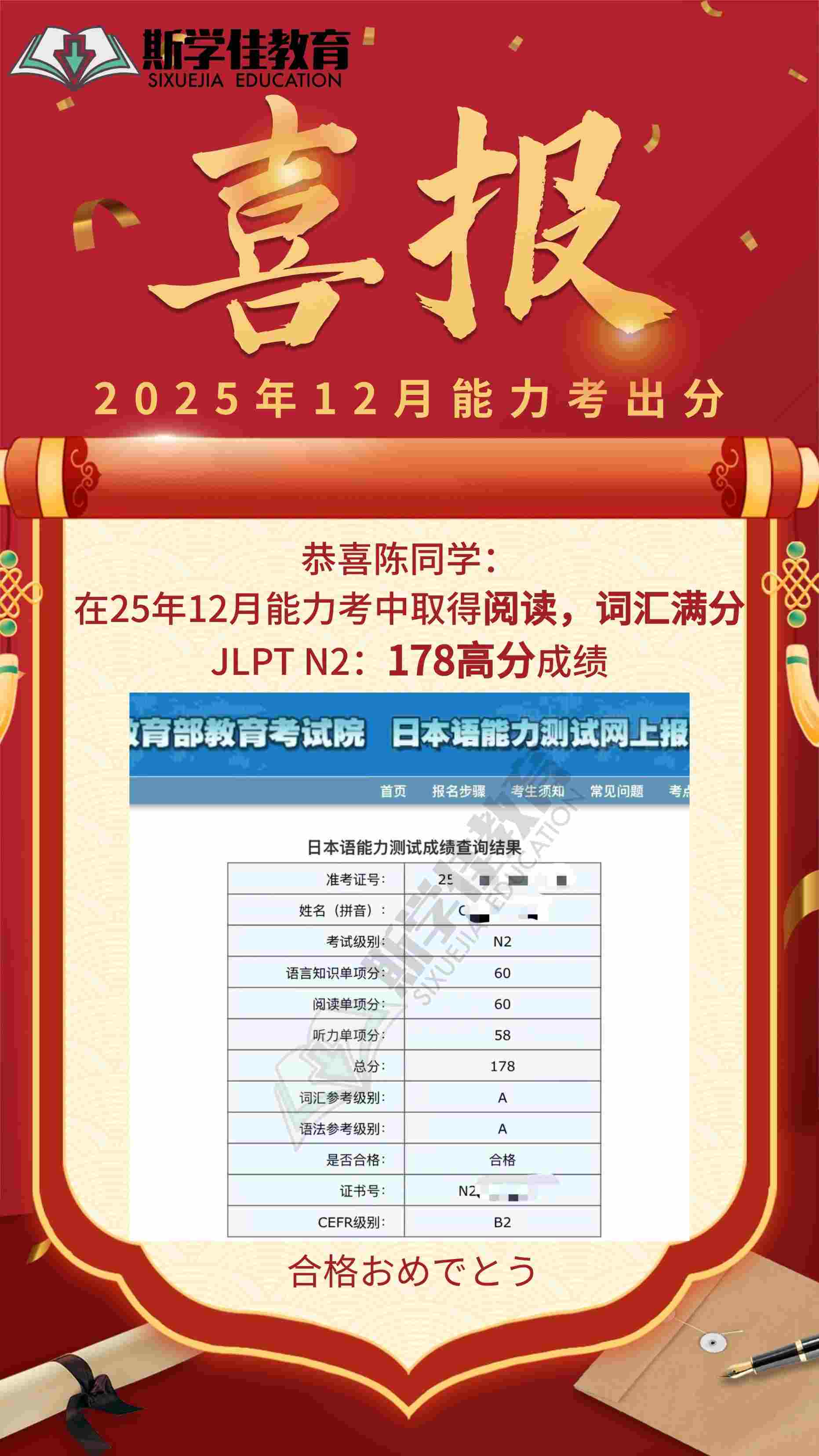 25年结束,26年伊始 又到JLPT收获日 在这次日语JLPT成绩中 斯学佳日语学员,再次刷新高分 一张张成绩单的背后 是学员们日夜兼程的努力 也是老师们专业细致的指导 让我们一起来看看这些亮点时刻 沾沾欧气~~